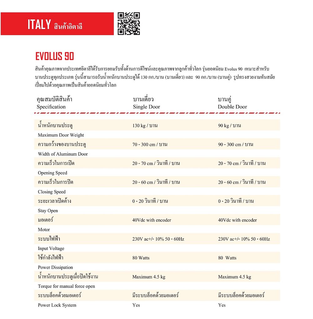 สินค้าคุณภาพจากประเทศอิตาลี การทำงานเปี่ยมไปด้วยประสิทธิภาพรูปทรงสวยงามทันสมัย นิยมใช้ทั่วโลกเป็นสินค้าคุณภาพที่เรากล้ารับประกัน รุ่น Evolus 90 สามารถรับน้ำหนักบานเดี่ยวได้ 130 กก/บาน และ บานคู่ 90 กก/บาน สามารถใช้กับบานประตูได้ทุกประเภท รุ่น Evolus 150 สามารถรับน้ำหนัก บานเดี่ยวได้ 200 กก/บาน และ บานคู่ 150 กก/บาน เหมาะสำหรับบานประตูที่มีน้ำหนักมาก